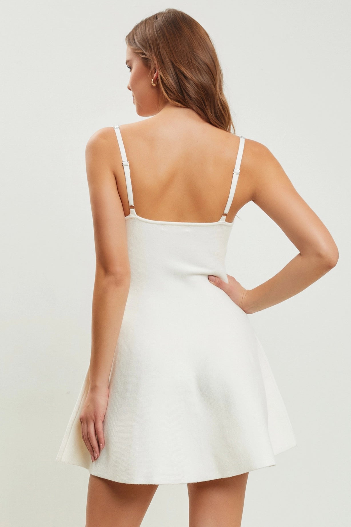 • Off-white colored sweater party dress with flared skirt.
